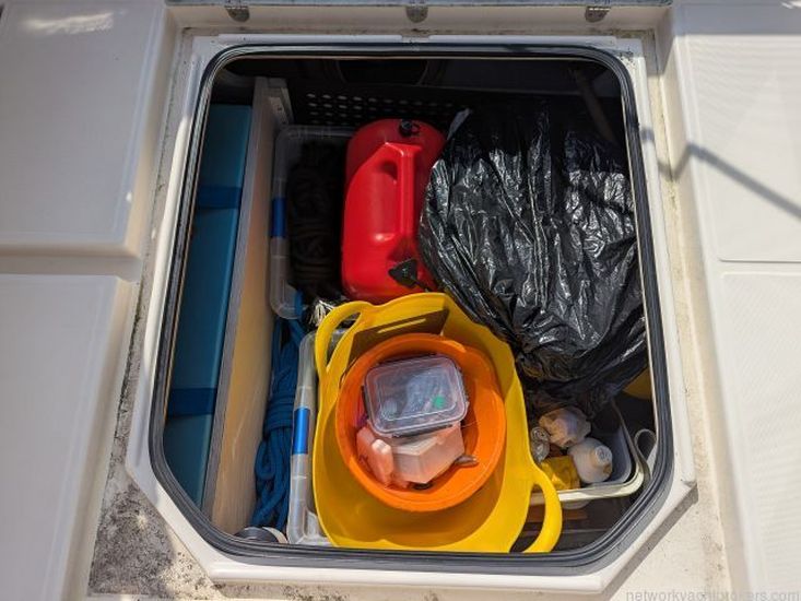 It has a separate heads compartment with a marine toilet and with washbasin with manually pumped cold water. A very large cockpit lazarette provides ample storage for fenders, warps and other deck gear.